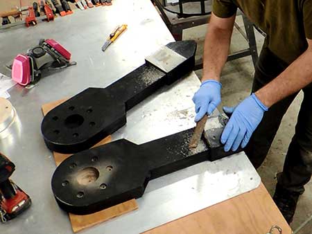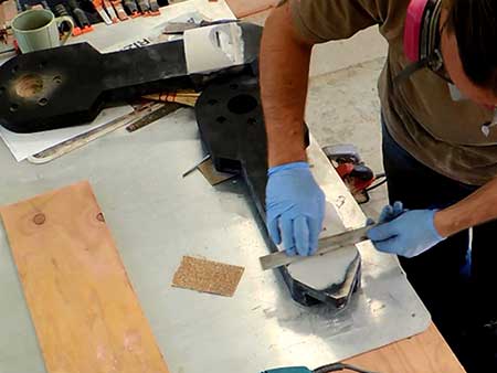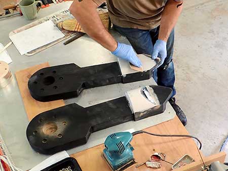 After Rasping the Glass-Filled polyester that I used to repair the tops of the Beefies, I applied a generous smear of light Bodyfiller, followed by some glazing putty, and sanded to a nice smooth finish.