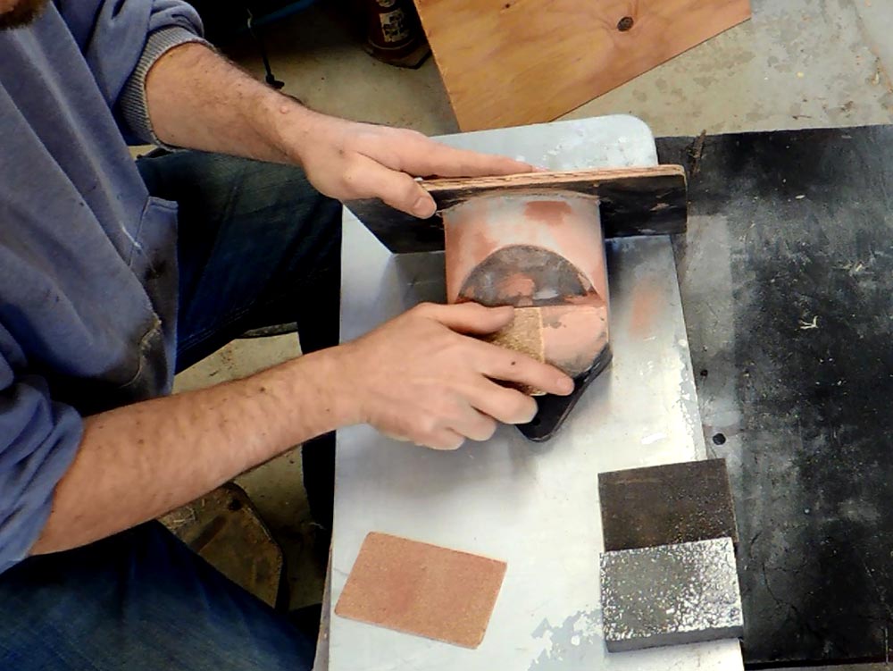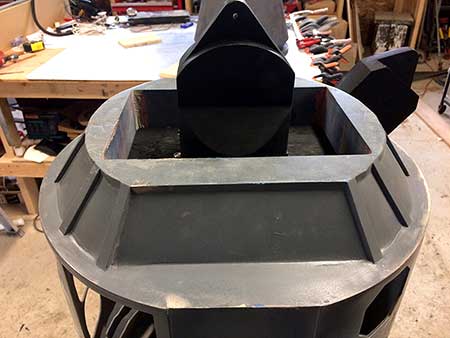 With all my talk earlier about the Legs, I neglected to mention the Center Ankle, which I built at the same time and, basically, the same way. Really nothing ground breaking here, just another Birch Ankle. The ankle is attached to a piece of ½” Birch ply with screws and lags (shown in these pictures with temporary Spruce). This Birch plate is then bolted thru the bottom of my Body Cylinder and attaches to my simple Frame, which in turn ties all three legs together keeping them rigid. This frame, which I’ll discuss here later was a concession that I made while I was experimenting with my Frameless Body Design. I was closing in on this frameless body, but got impatient and wanted to get going on this droid before I had perfected my leg attachments. In the end I wound up using a simple frame after all.