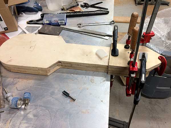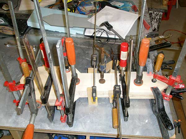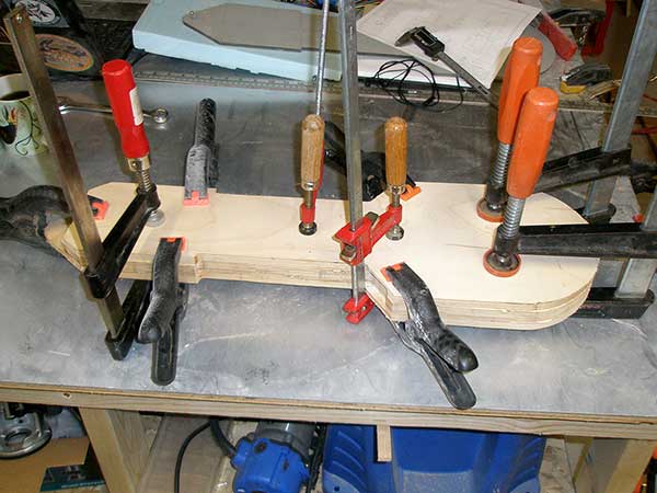 The three main layers were then carefully glued and clamped overnight, using just about every small bar clamp I have… I used a PV wood glue from Gorilla Glue which I have had great luck with in the past. The last layers, which finish off the lower leg, needed to be planed down by a couple mm so that the final thickness matched the Club Specs and they were glued and clamped as well.