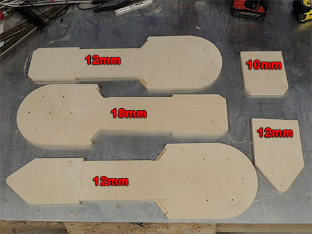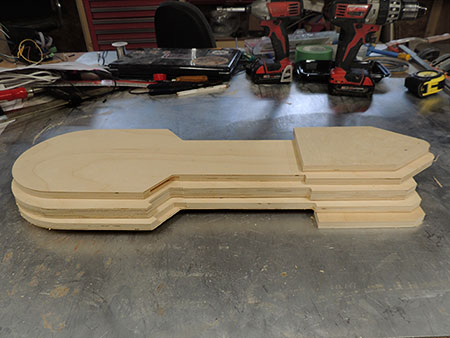 You will notice that I cut a slot in the 18mm layer; this is to provide a conduit for the wires that will be running down the legs to the drive motors I plan to install in the feet. I did have to go back and cut the recesses into the outer layers to create the pockets for the Shoulder Stabilizers. I was able to cut these areas on the 18mm layer with the bandsaw, then transfer the pattern to the 12mm layers to finish with a router.