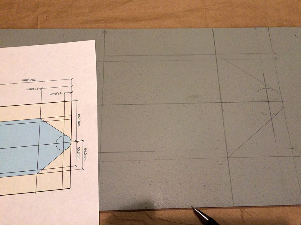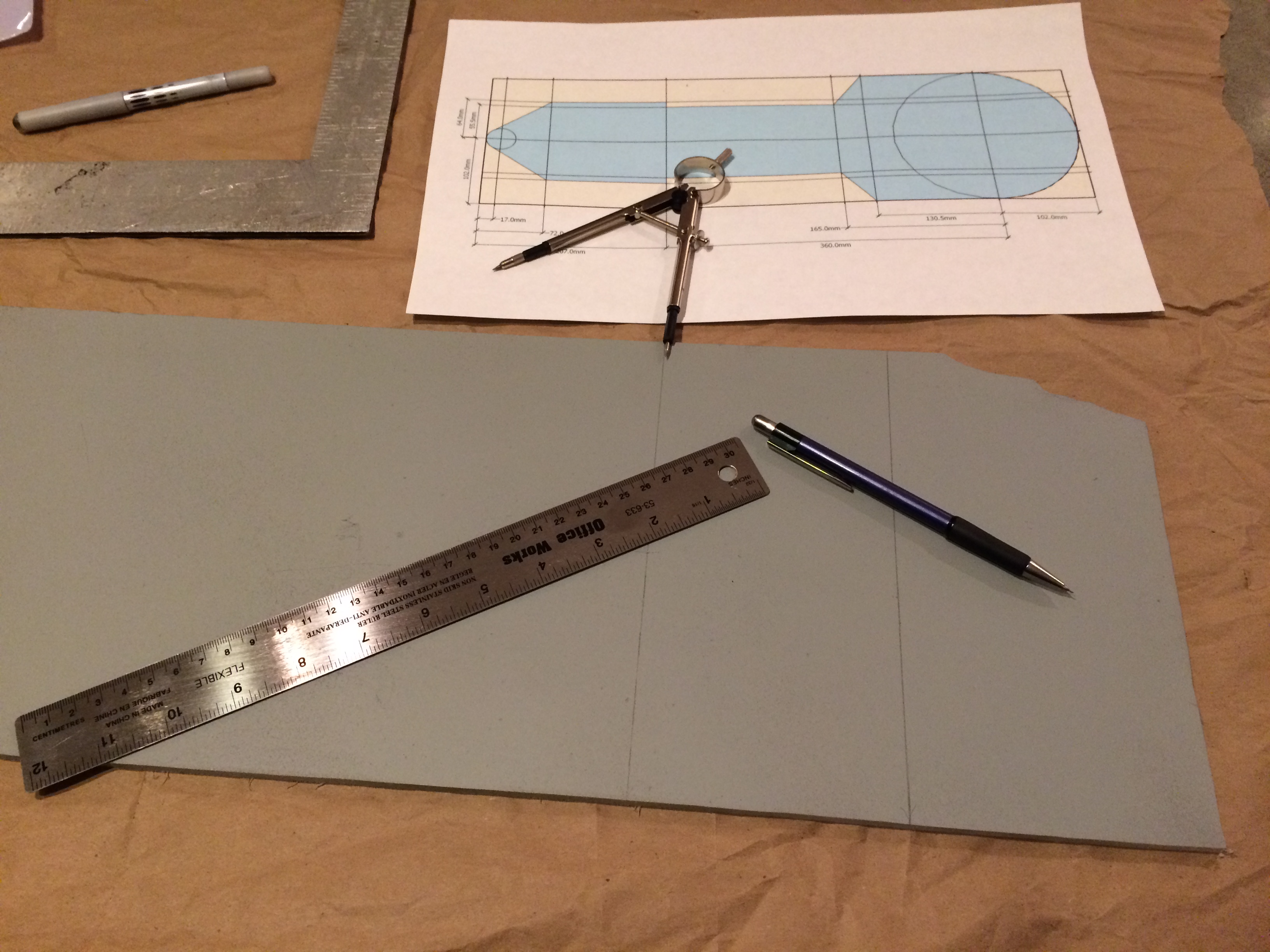 I’m going to begin my Legs project by making an acrylic Template. This template will then be used to finish the ply-wood layers on my router table. I considered printing out a full-scale drawing based on the Club Blueprints to transfer to my template material but instead I did a new drawing with all the important dimensions in place, and used that to layout the leg outline by hand on my template material.