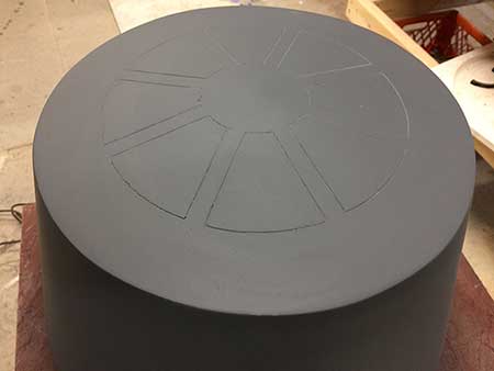 I first modeled the dome in Fusion360 using the dimensions found in the Club Blueprints area. I then used this model to cut a reduced foam core on my CNC router out of blue insulation foam which was glued up to provide the height. (again, I have no pictures of this part of the build… sadly). I applied a surface coat of Glass reinforced body filler, knocked that back with a rasp then coated that with regular body filler and started sanding… This filling and sanding is what made my weekend project last a week! Luckily, I had some help with the sanding…